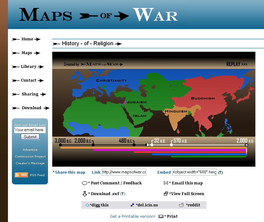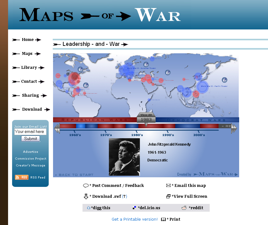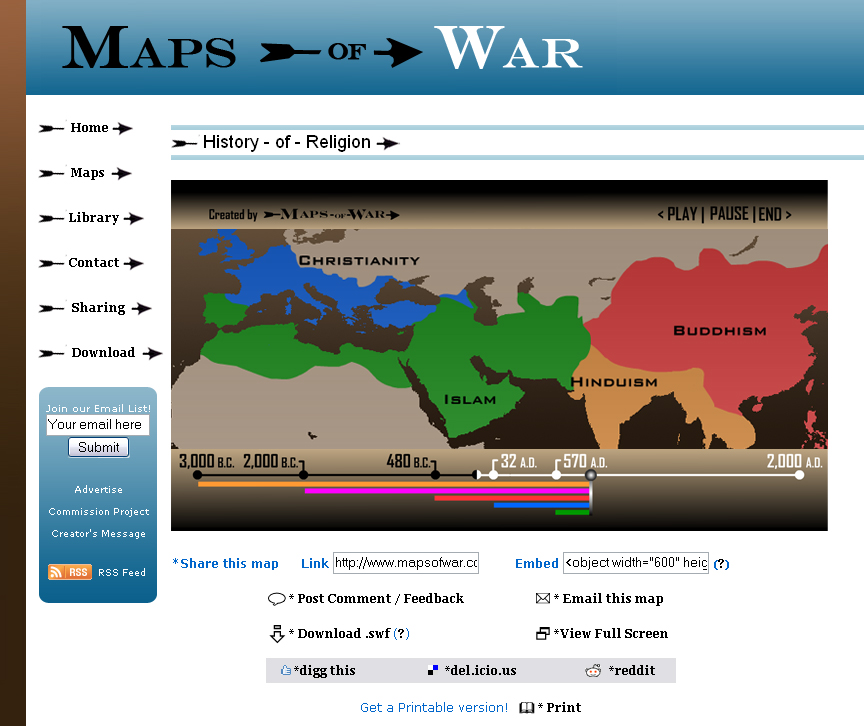 "This website is a product of my creativity and free time. I love history, and wanted to create something that showed the 'Big Picture' of war instead of the battle-by-battle view we always see through the narrow spyglass of the mainstream media. It's all about the 'Big Picture' of history, not measured in years, but in centuries. The media does not show us this viewpoint and my hope is that Maps-of-War will help fill this gap."